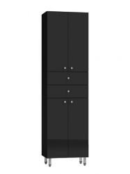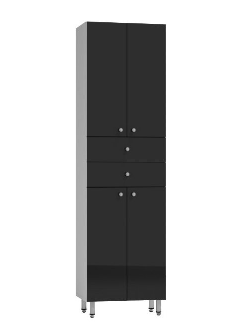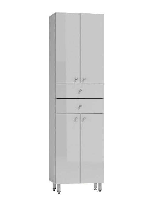 Oczywiście nadaje się do każdego wnętrza według gustu i potrzeb klienta. Szafka posiada dwoje drzwi w górnej części,w których znajduje się jedna regulowana półka, co daje dwie przestrzenie do zagospodarowania, a także dwie szuflady np. na przybory toaletowe, w dolnej częsi znajduje się jedna półka dając dwie przestrzenie do zagospodarowania. Dzięki regulowanej półce łatwo znajdują miejsce przedmioty w większej wysokości, np. płyny do płukania.Szafka posiada metalowe regulowane nóżki w kolorze chrom o wysokości 100mm. Szuflada na prowadnicach metalowych.