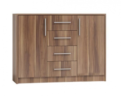 Komoda przeznaczona do salonu, biura, pokoju lub sypialni. Za drzwiczkami znajduje się 1 półka (2 przestrzenie) w każdej z szafek. W komodzie zainstalowano 4 szuflady.