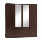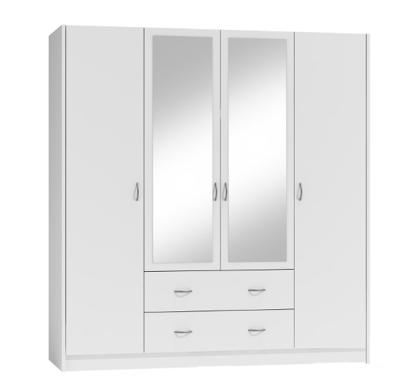 Korpus i front garderoby wykonany jest z mocnej płyty marki Kronopol, obustronnie laminowanej o grubości 18mm. Krawędzie są oklejone obrzeżem PCV. Uchwyty są metalowe w kolorze satyna. Szuflady osadzone na prowadnicach metalowych, płynnie wyjeżdżają. Zawiasy drzwi to metalowe, regulowane GTV. Drążek na wieszaki jest metalowy, pokryty chromem. Plecy szafki wykonano z płyty HDF o grubości 3,2 mm łączone plastikowymi listwami. Po ustawieniu kątów prostych, należy je przybić. Szklane lustra zostały naklejone na fronty drzwi. Mebel stoi na nóżkach 5mm typu ślizg. Całość skręcona na mimośrody i kołki. Konstrukcja jest stabilna, ciężka i nie kołysze się na boki. Jest to solidny mebel, który posłuży Ci wiele lat.